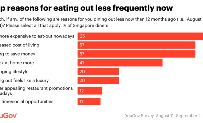 Despite Singapore being famous for its vibrant food culture, the rising cost of living is forcing many residents to rethink their habits. According to the Singapore Dining Out Report 2025 by YouGov, dining out frequency is decreasing: about one in three Singapore diners (32 percent) say they are eating out less frequently than they did a year ago. This drop is even more pronounced among older generations, climbing to 37 percent among Gen X and Baby Boomers+.